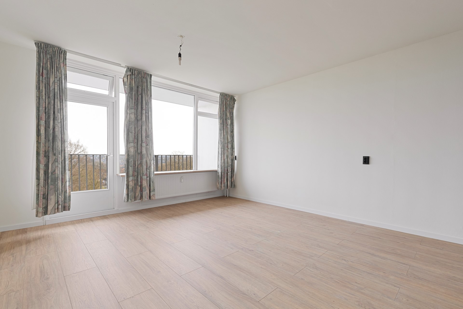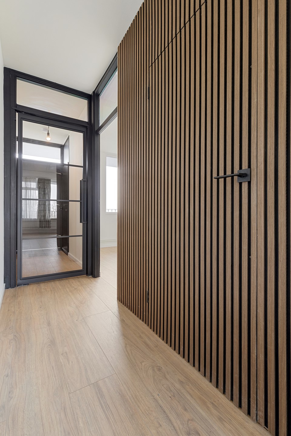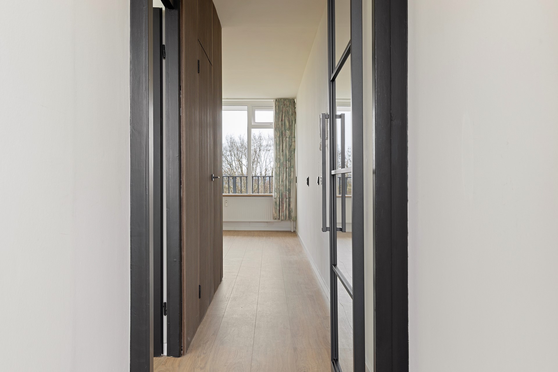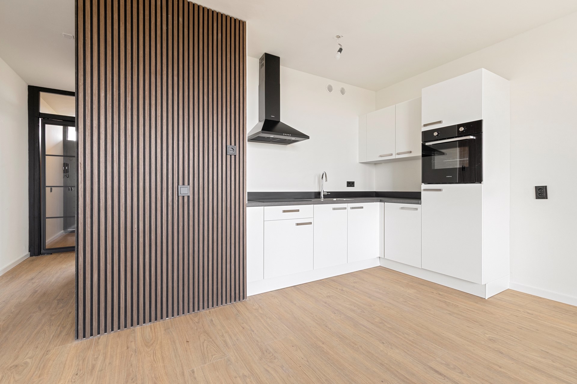 Hal/entree v.v. laminaatvloer, moderne stalen deur en meterkast. 1 ruime slaapkamer (3.30mx3.59m) v.v. laminaatvloer. Moderne recent geheel vernieuwde betegelde luxe badkamer (2.44mx1.40m) met fijne inloopdouche, modern wastafelmeubel met onderkastjes, vrij hangend toilet, elektrische warmwaterboiler en in een nis bevind zich een aansluitpunt voor wasmachine en droger. Gezellige woonkamer (4.81mx5.35m) met laminaatvloer en prachtig vrij uitzicht vanwaar toegang naar het balkon (4.69mx1.28m) en open keuken met moderne witte (nieuwe) aanbouwkeuken incl. inbouwapparatuur, te weten, oven, koelkast, inductiekookplaat en wasemkap.