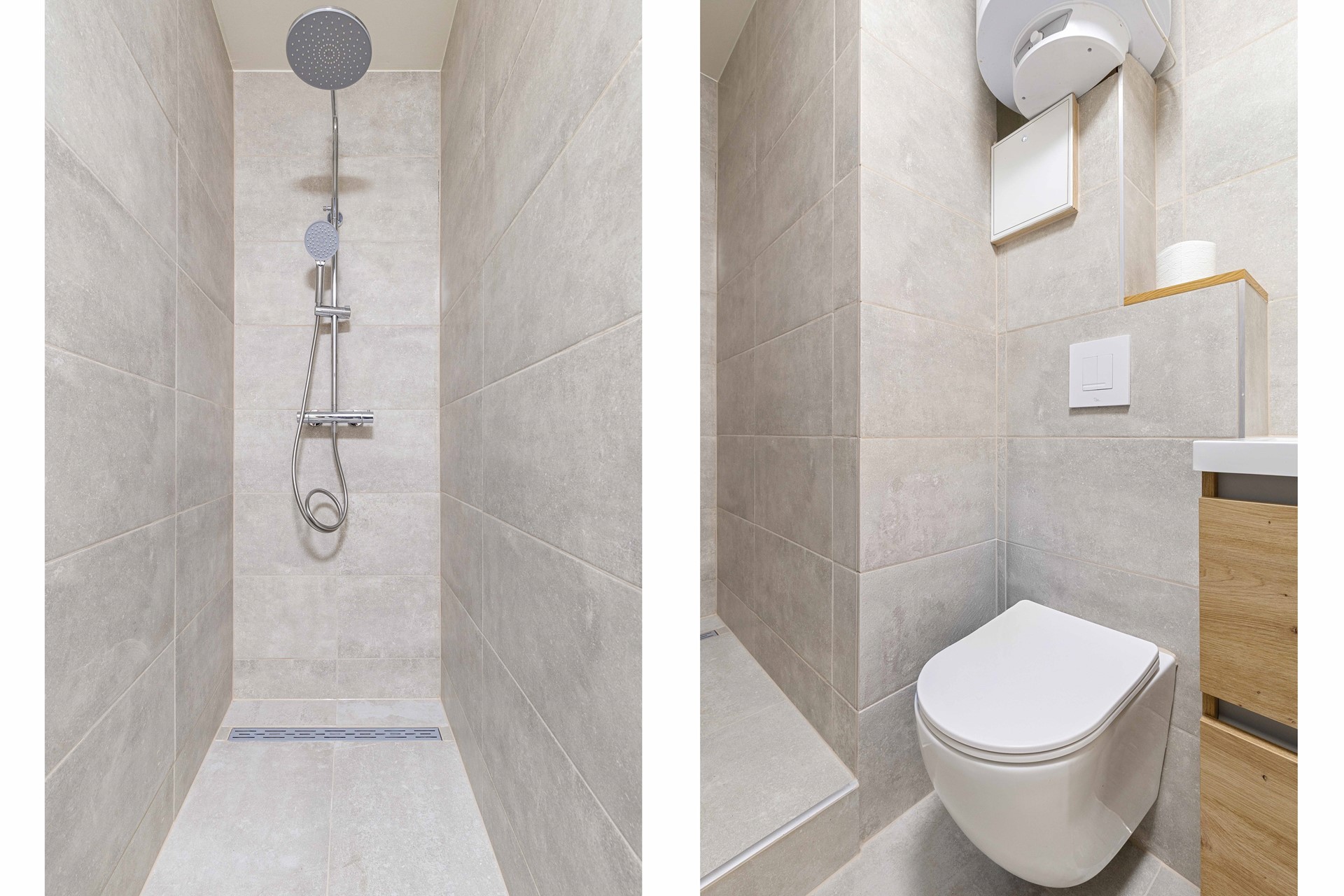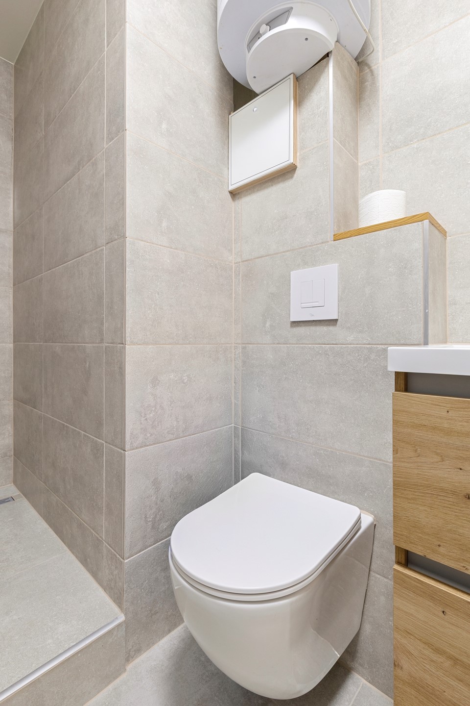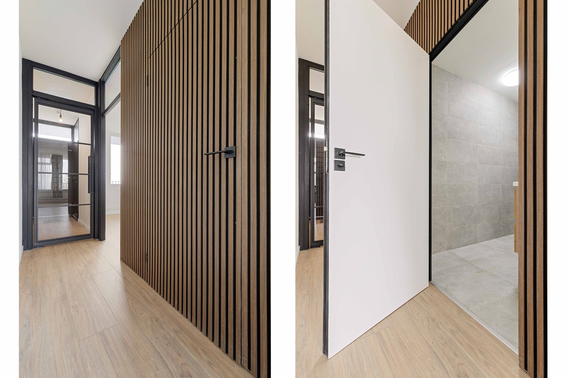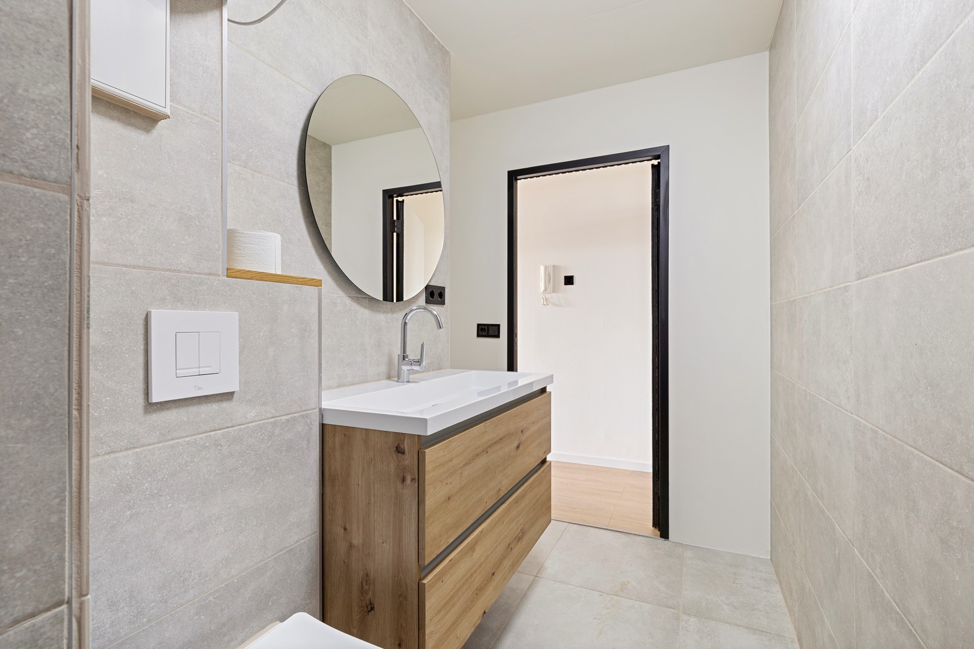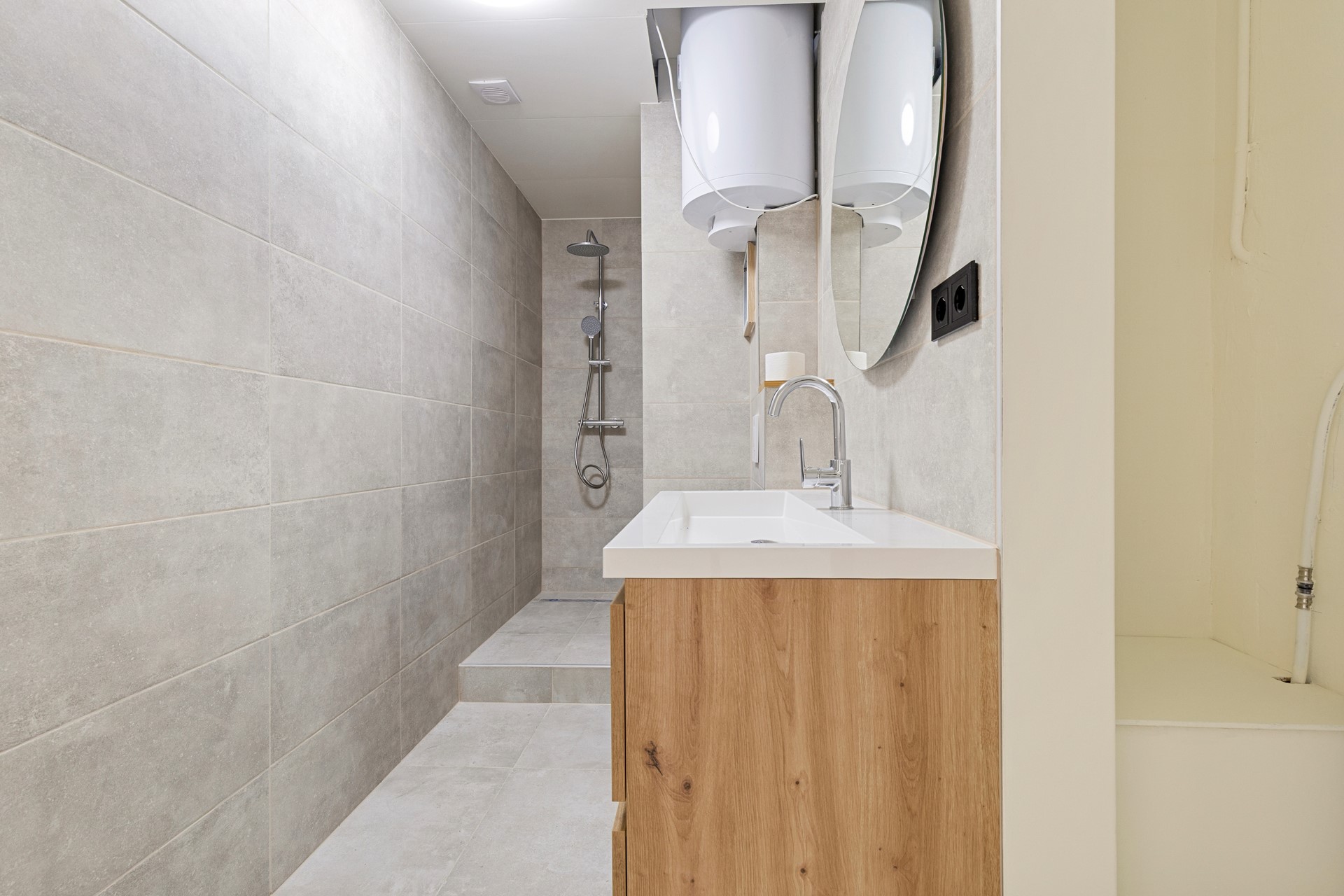 Hal/entree v.v. laminaatvloer, moderne stalen deur en meterkast. 1 ruime slaapkamer (3.30mx3.59m) v.v. laminaatvloer. Moderne recent geheel vernieuwde betegelde luxe badkamer (2.44mx1.40m) met fijne inloopdouche, modern wastafelmeubel met onderkastjes, vrij hangend toilet, elektrische warmwaterboiler en in een nis bevind zich een aansluitpunt voor wasmachine en droger. Gezellige woonkamer (4.81mx5.35m) met laminaatvloer en prachtig vrij uitzicht vanwaar toegang naar het balkon (4.69mx1.28m) en open keuken met moderne witte (nieuwe) aanbouwkeuken incl. inbouwapparatuur, te weten, oven, koelkast, inductiekookplaat en wasemkap.