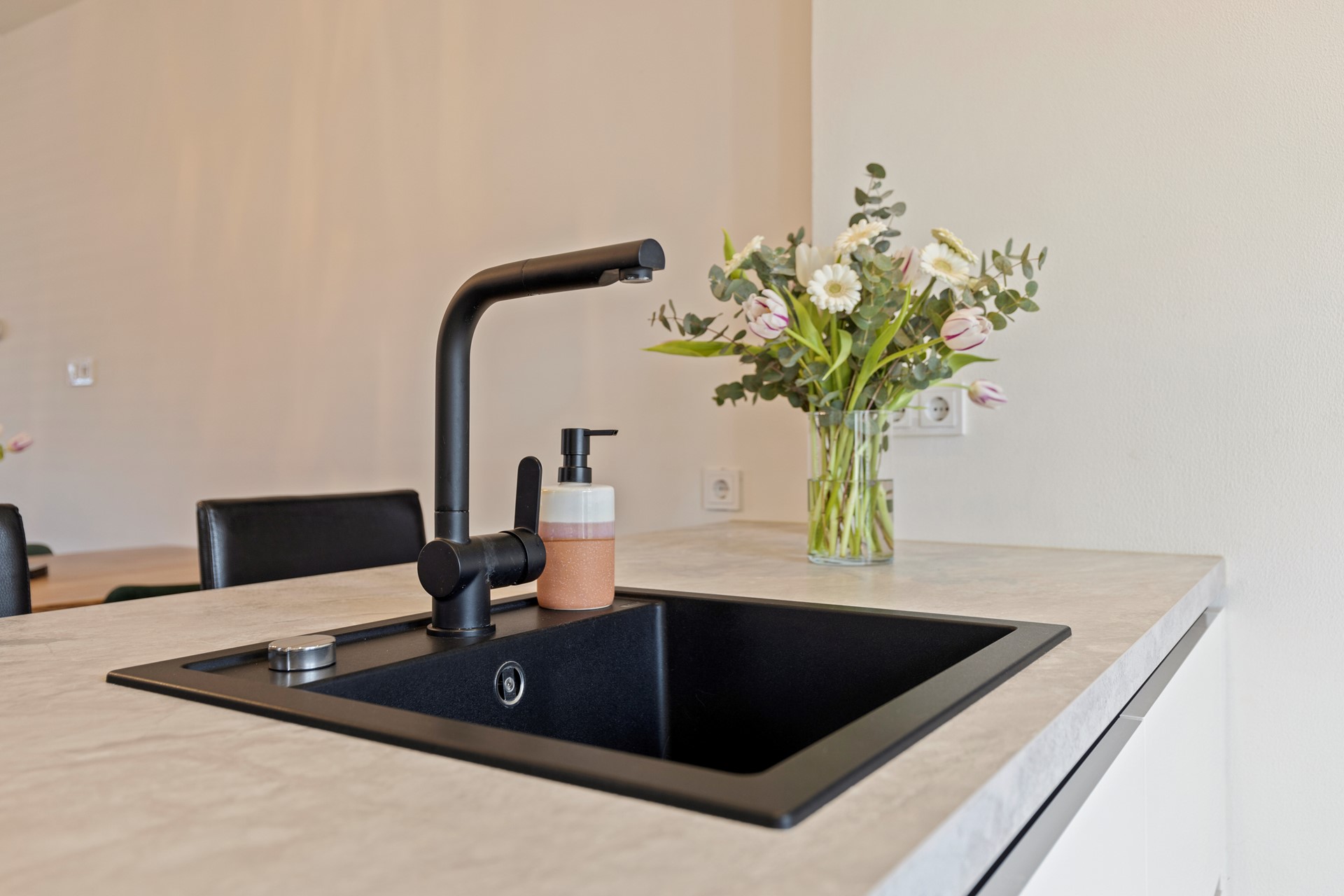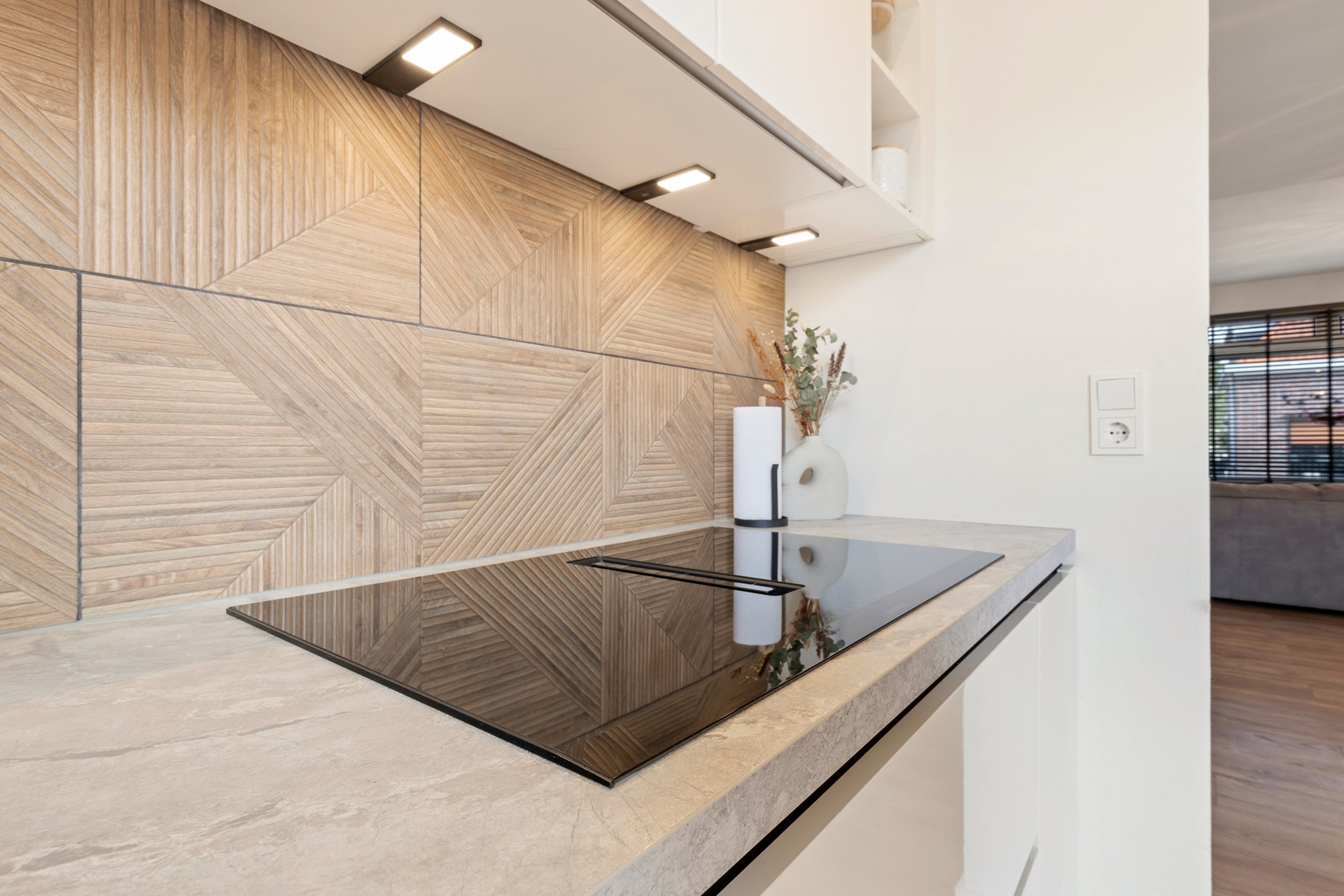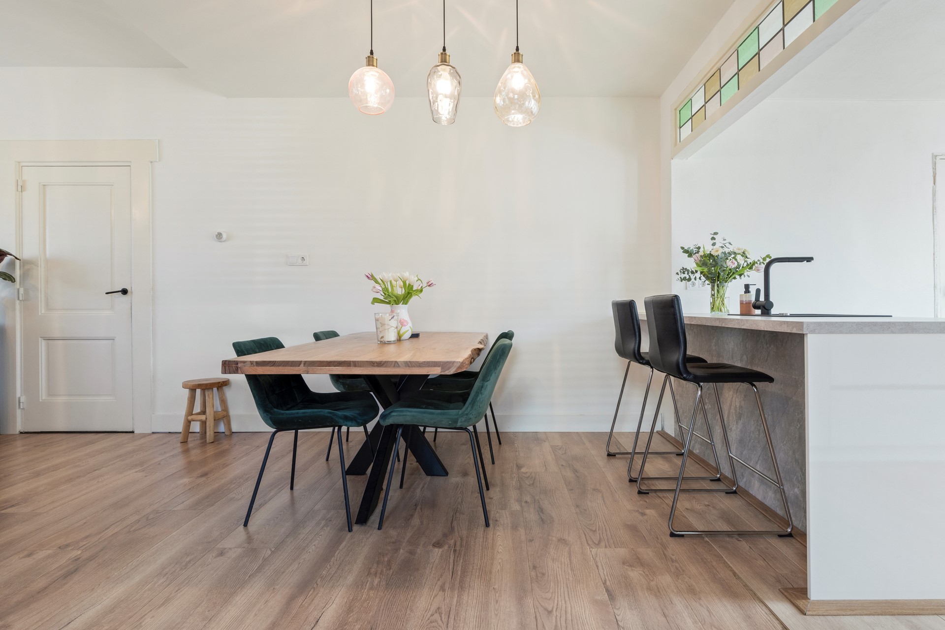 Royale woonkamer met laminaatvloer en staat in open verbinding met de ruime keuken met moderne installatie met kookeiland, en inclusief inbouwapparatuur, te weten, inductie kookplaat met kookveldafzuiging, vaatwasser, combi-oven en koel/vriescombinatie. Via de keuken heeft men via openslaande deuren toegang tot het ruime terras en de diepe tuin.
