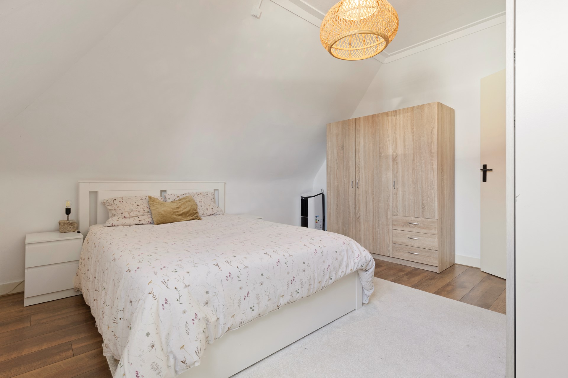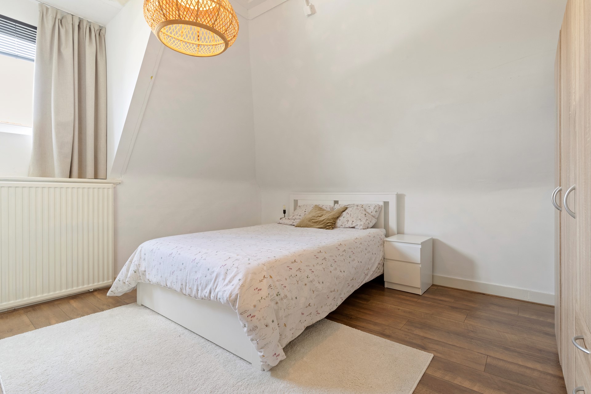 Slaapkamer 1 voorzien van een laminaatvloer en dakkapel