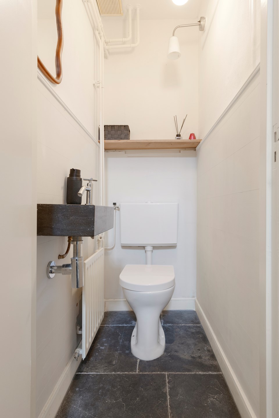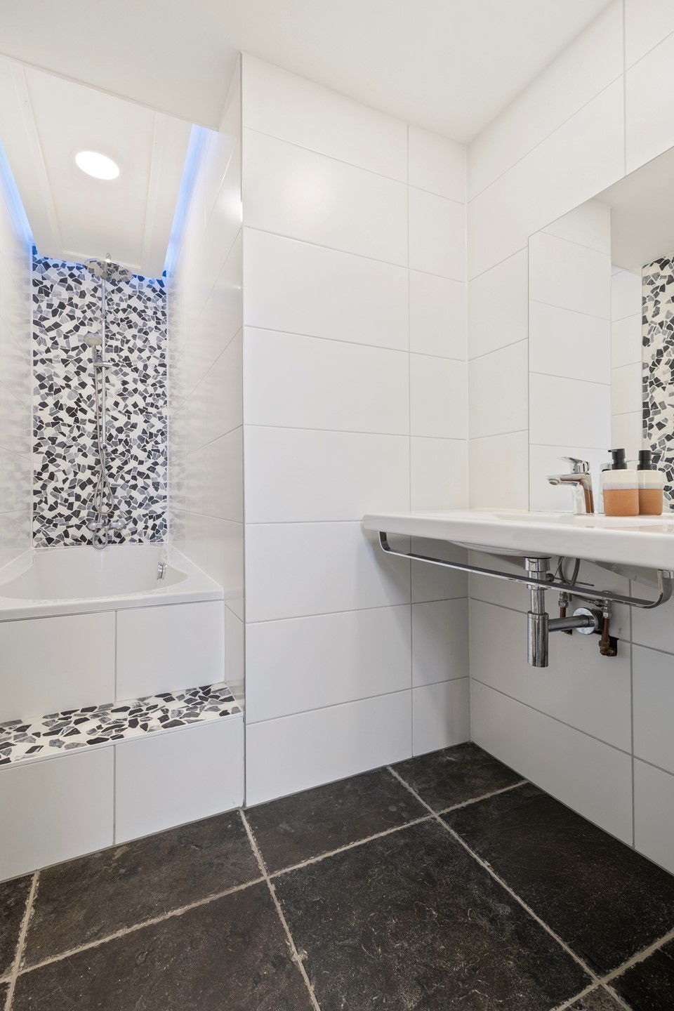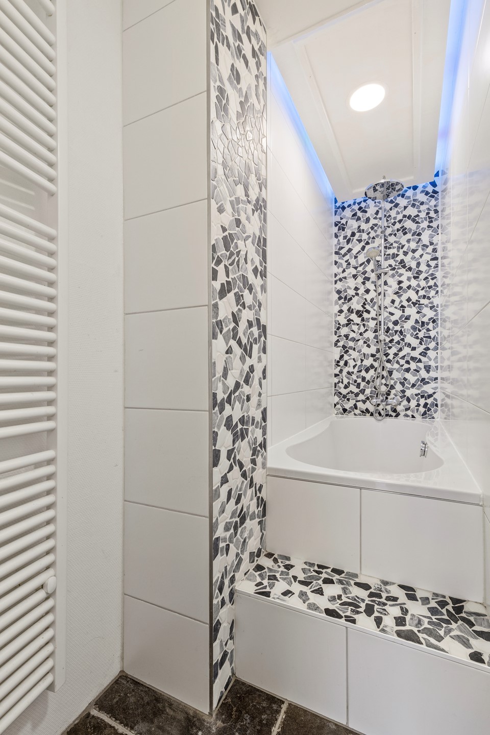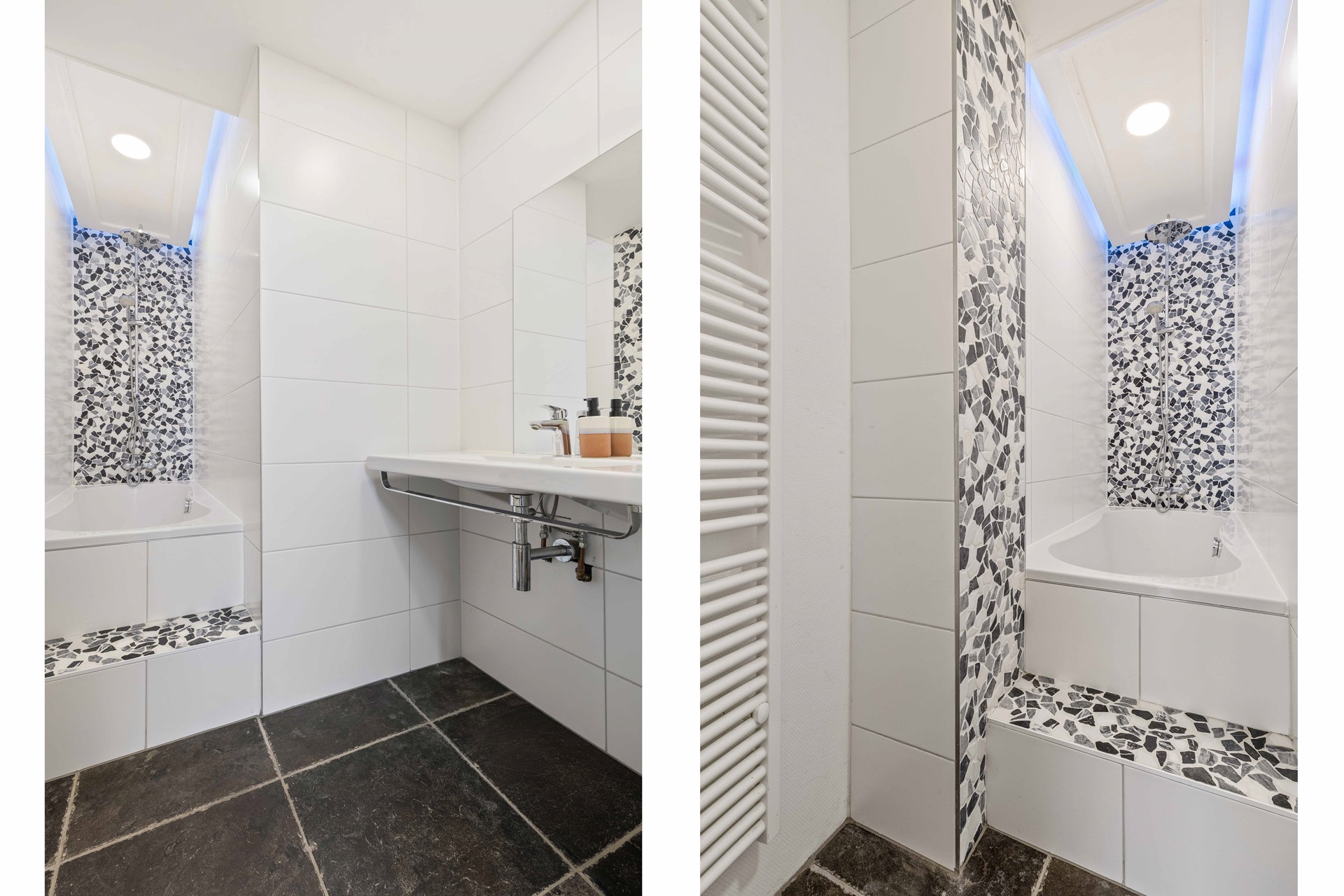 Nette betegelde badkamer voorzien van brede wastafel, ligbad en designradiator en verlichte en verwarmde designspiegel.