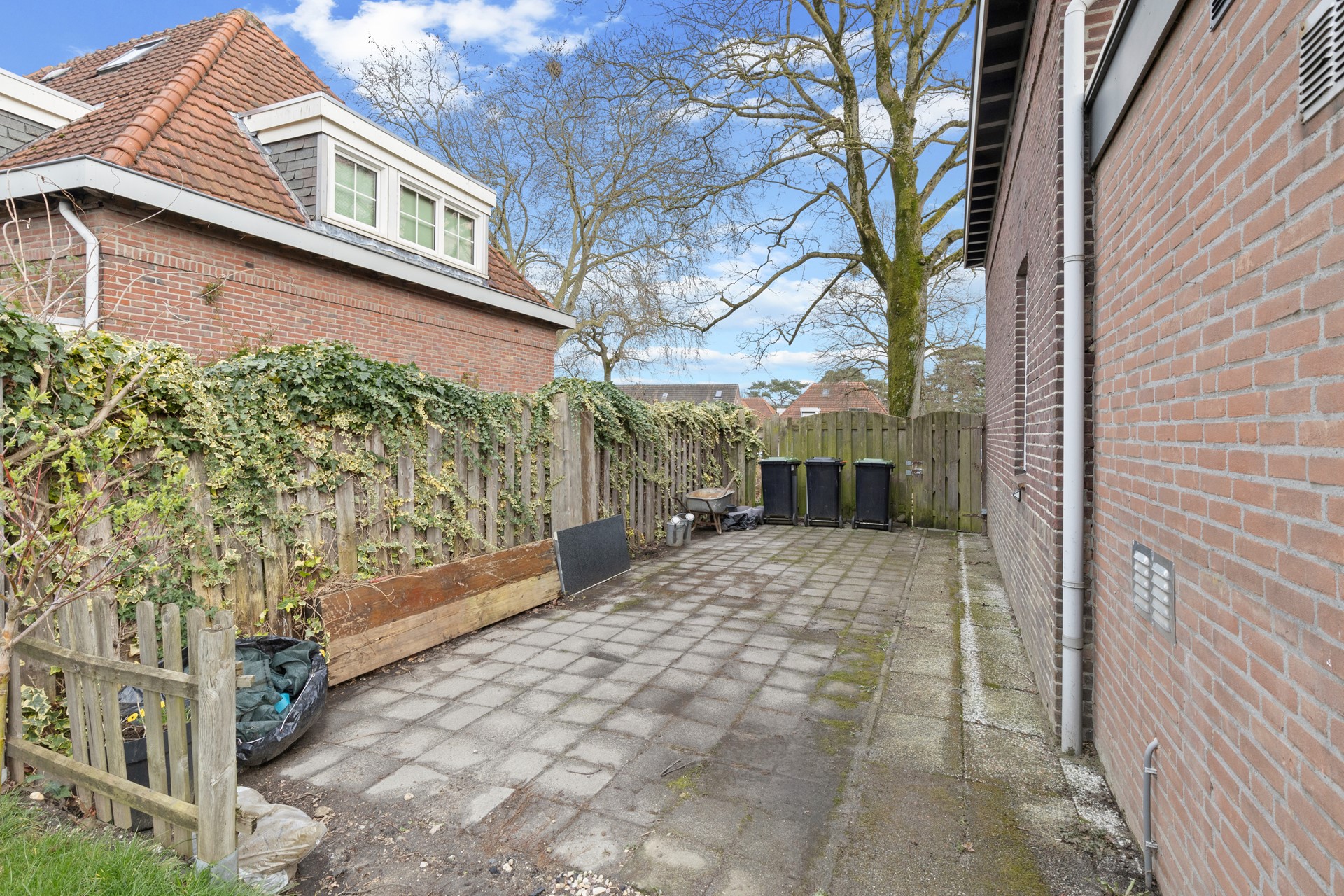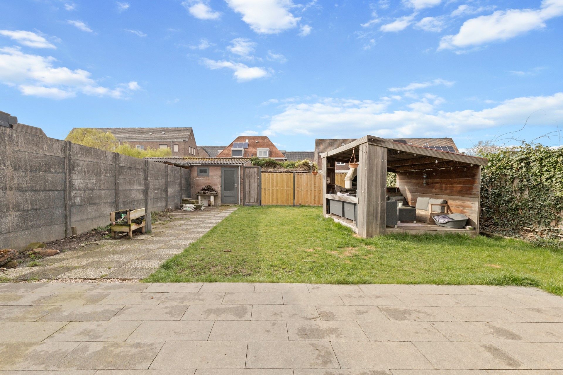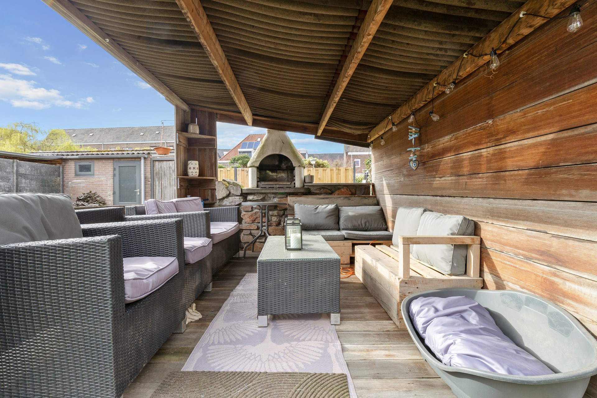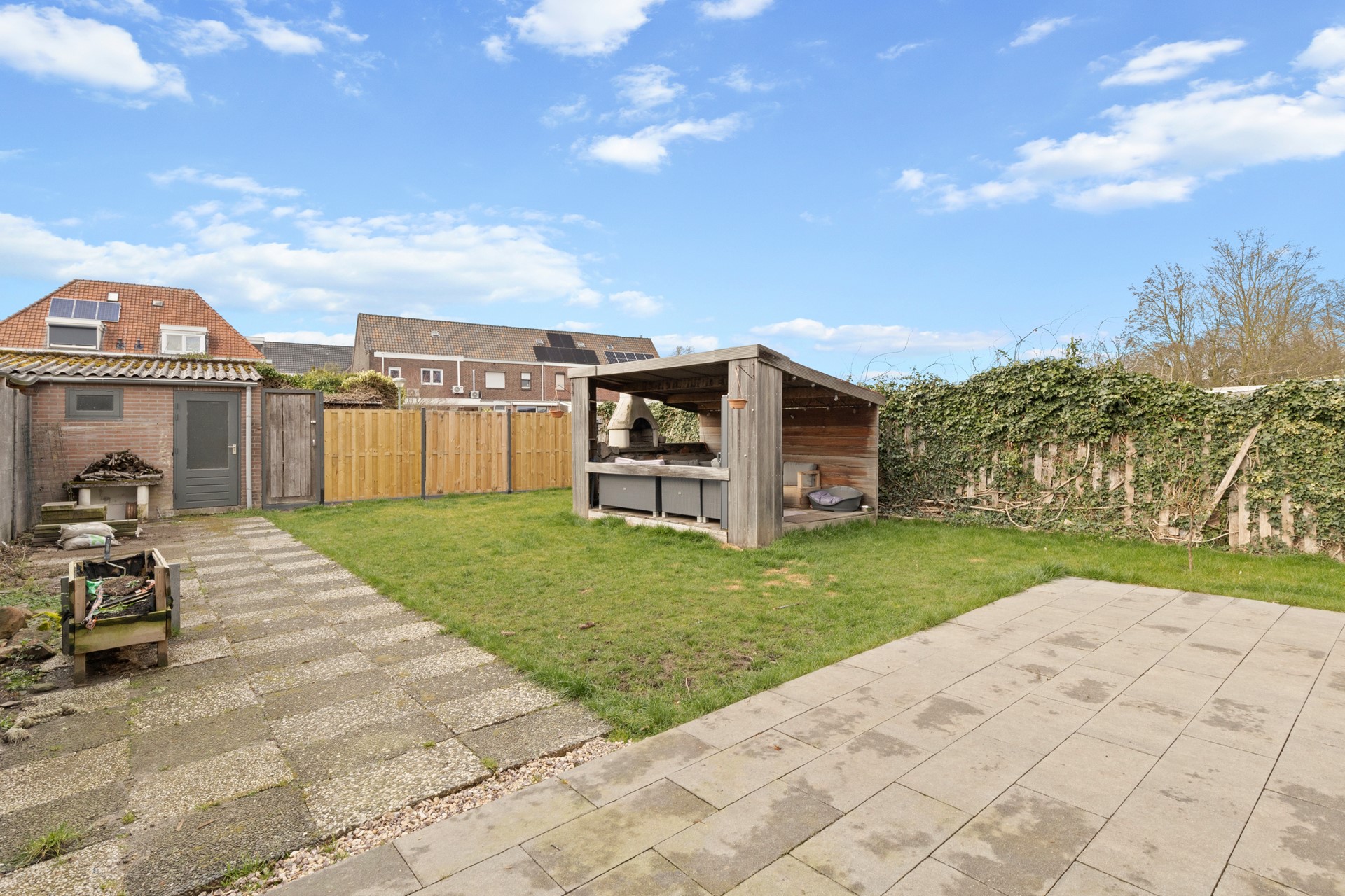 Goed aangelegde 14 meter diepe gezellige achtertuin met overkapt terras met buitenhaard, stenen garage met stalen kantelpoort en separate achteringang alsmede een zij-ingang naast de woning.