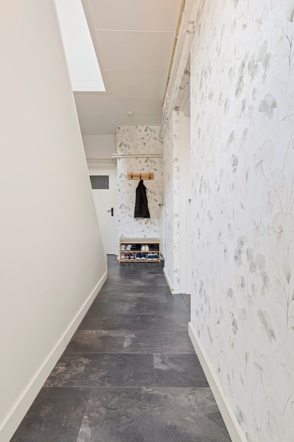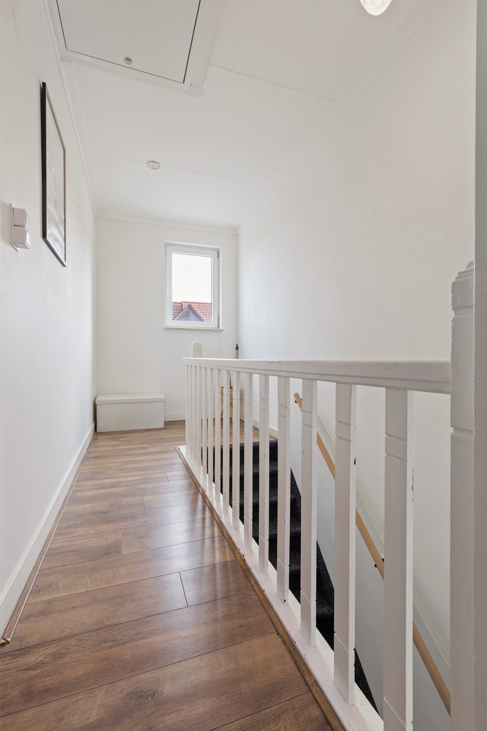 Overloop met laminaatvloer en toegangsluik naar de bergzolder,