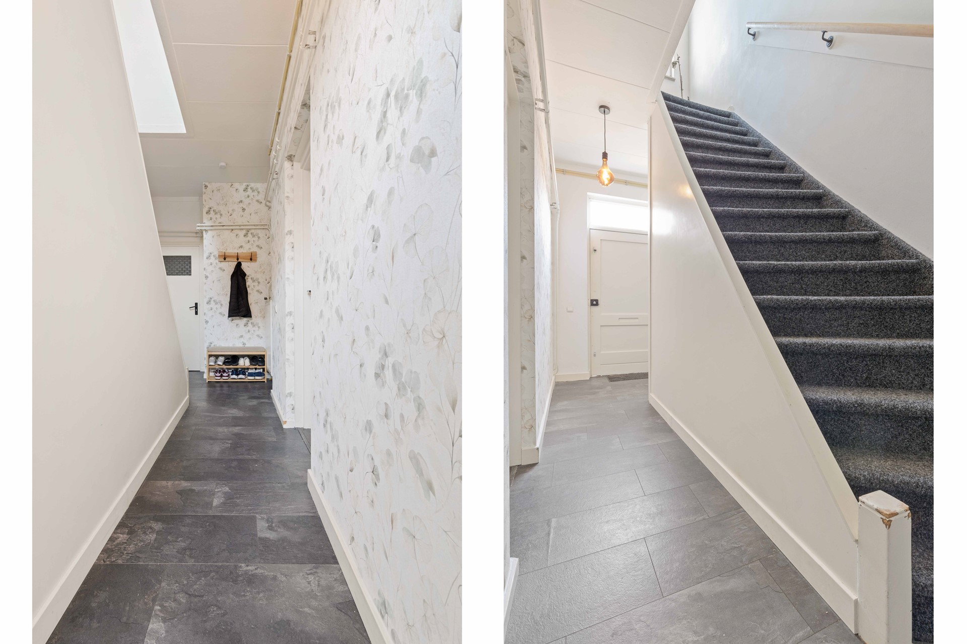 Hal/entree met laminaatvloer, meterkast, opgang naar de 1e verdieping , Toiletruimte met fonteintje, toegang naar de kelder alsmede toegang naar de woonkamer.