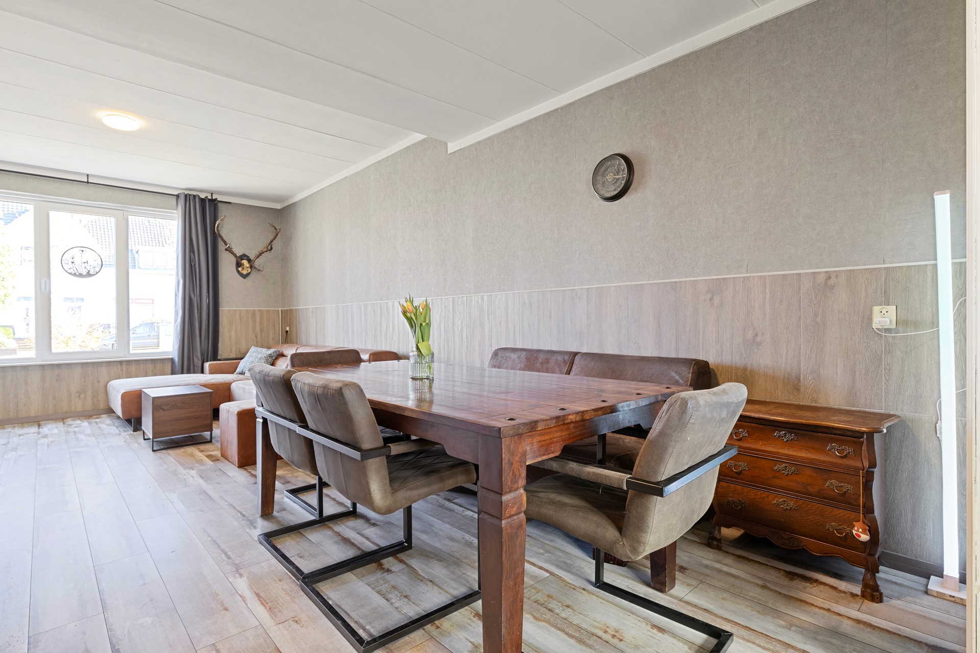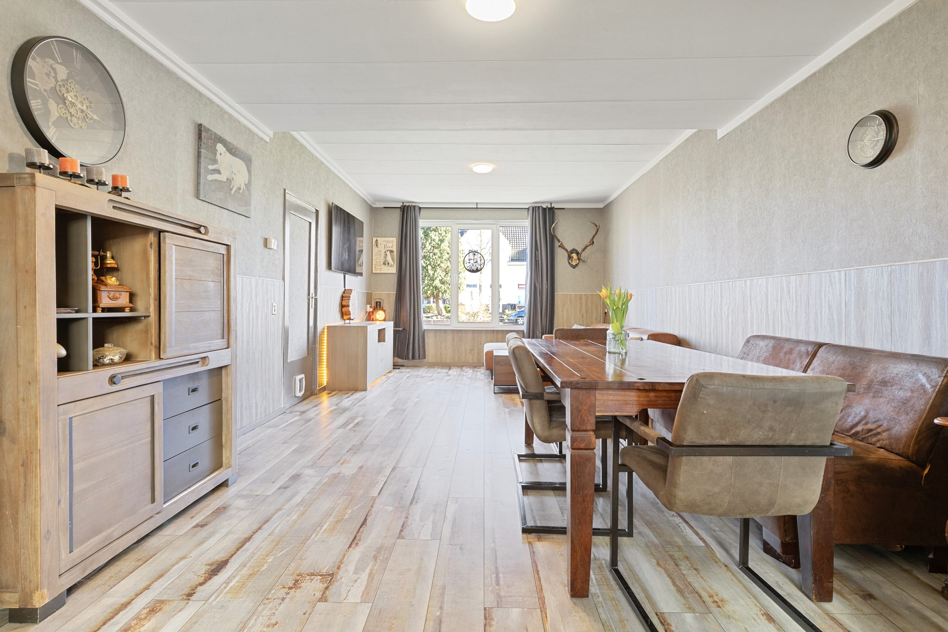 De begane grond is nagenoeg geheel v.v. kunststof kozijnwerk en dubbele beglazing.