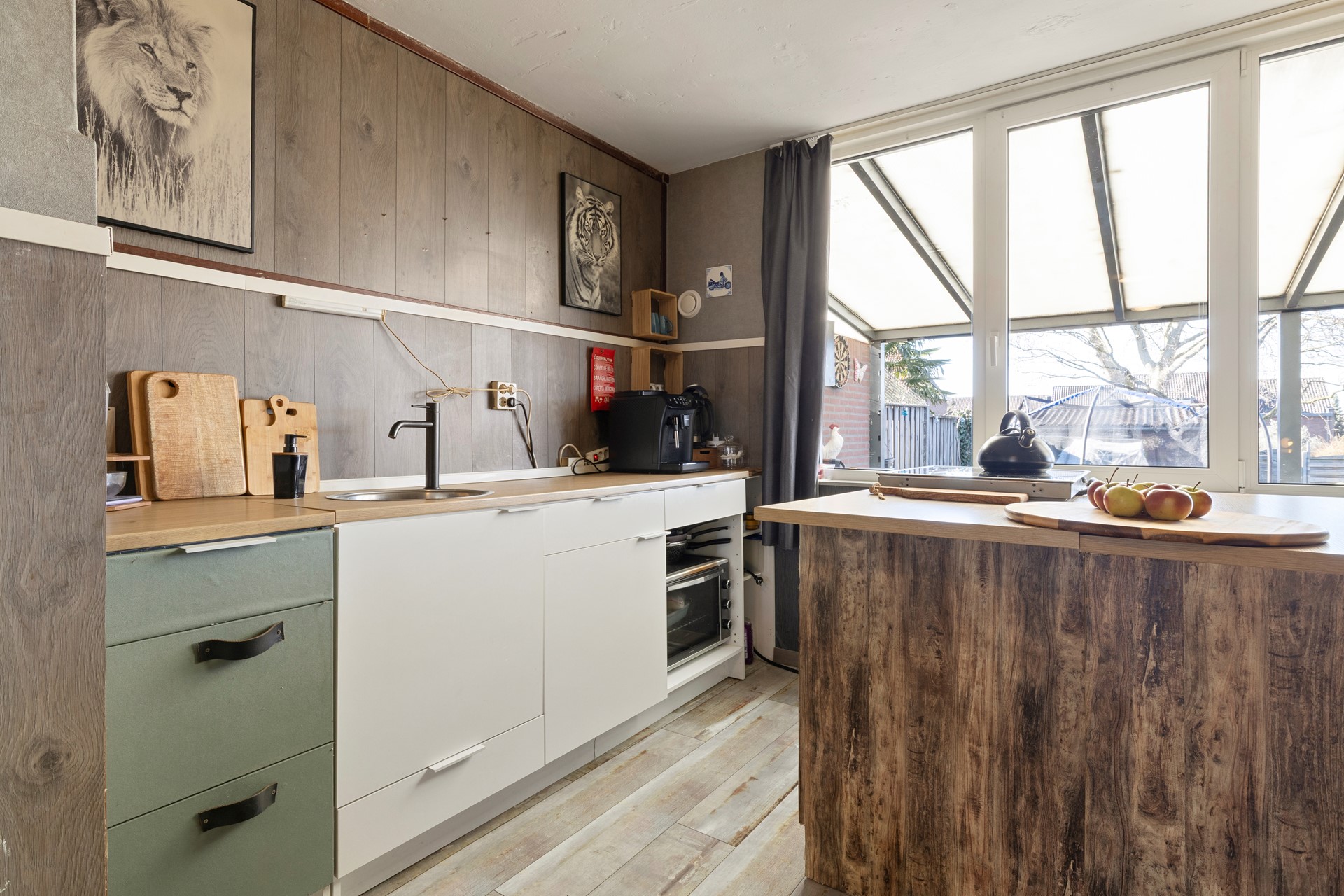 Ruime doorzon woonkamer v.v. een laminaatvloer, open keuken v.v. laminaatvloer en eenvoudige keukeninstallatie excl. inbouwapparatuur. Bijkeuken v.v. tegelvloer en aansluitpunten voor wasmachine en droger alsmede standplaats C.v.-combiketel (huur). Vanuit de bijkeuken is het geheel overdekte terras aan de achterzijde bereikbaar alsmede de diepe achtertuin.