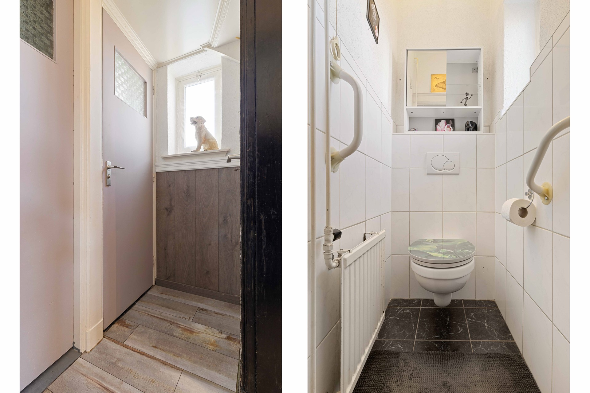 Hal/entree v.v. laminaatvloer, meterkast, betegelde toiletruimte en betegelde eenvoudige badkamer met hoek-bad .