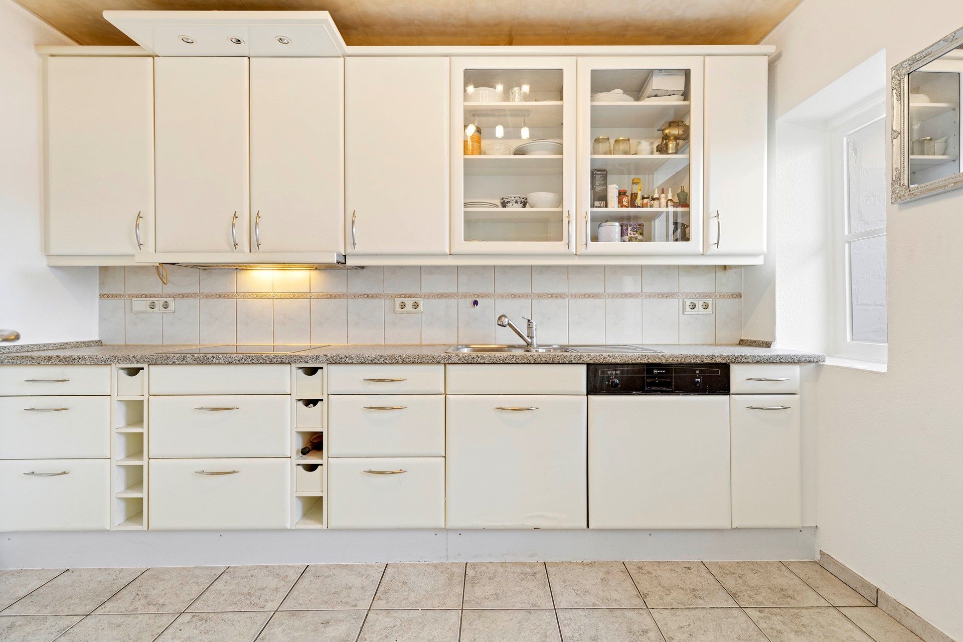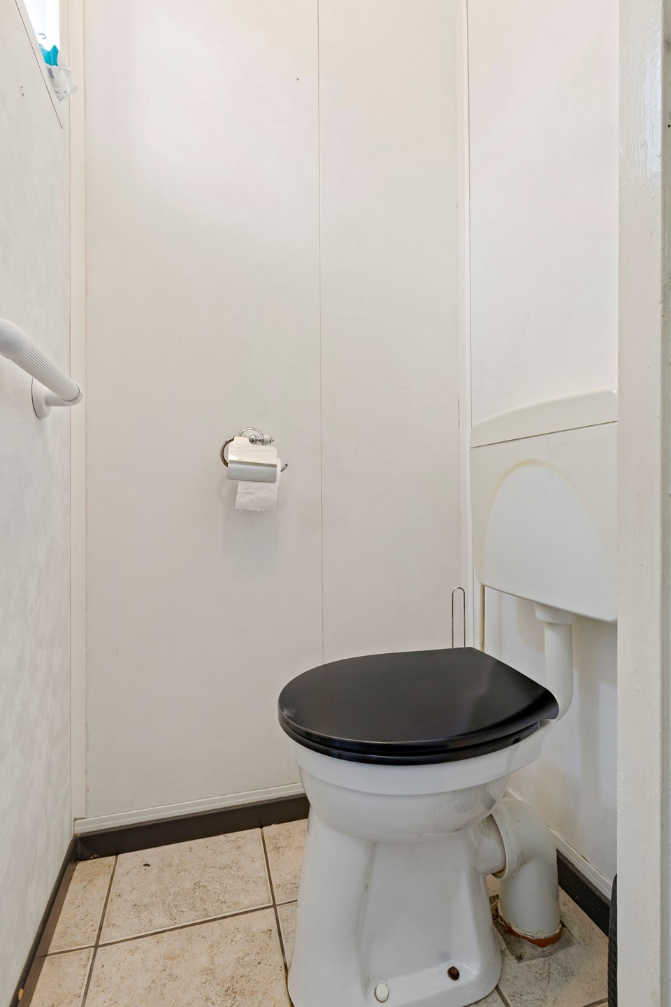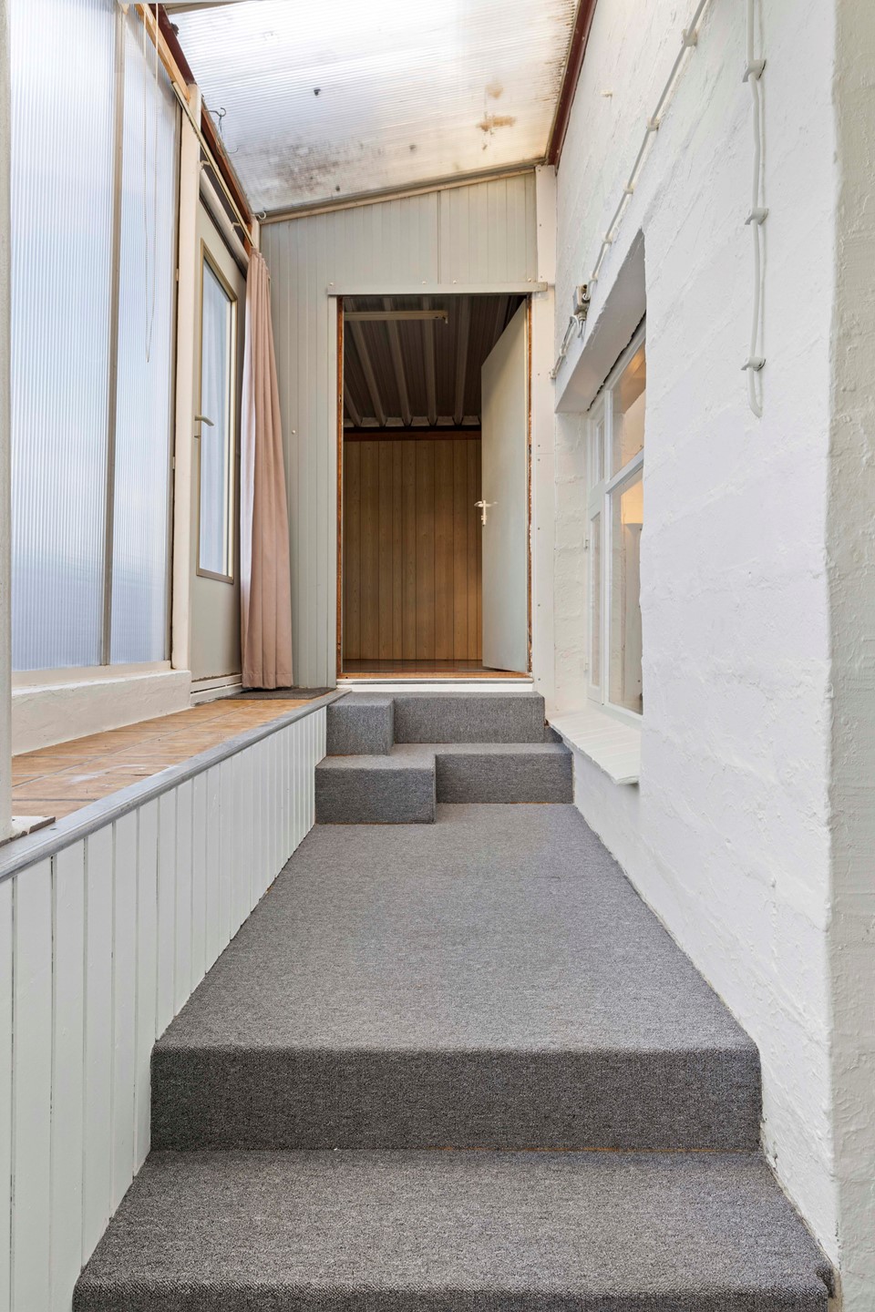 Entree. Hal met meterkast. Toiletruimte. Keuken met functionele keukeninstallatie met apparatuur. Woonkamer met open keuken met lichte plavuizenvloer en witte keukeninstallatie. Toegang tot een serre. Aansluitend een grote kantoorruimte/ werkkamer met toegang naar loods. Eventueel mogelijkheid tot verdere uitbreiding van de woonoppervlakte door verdere afwerking van de kantoorruimte. Dakterras met goede privacy.