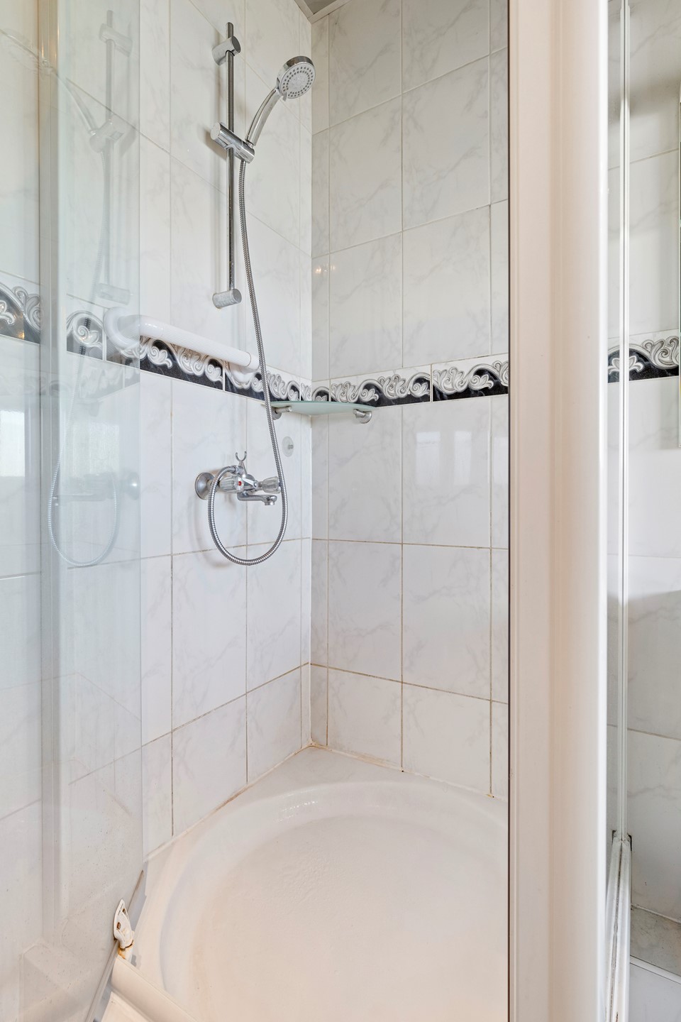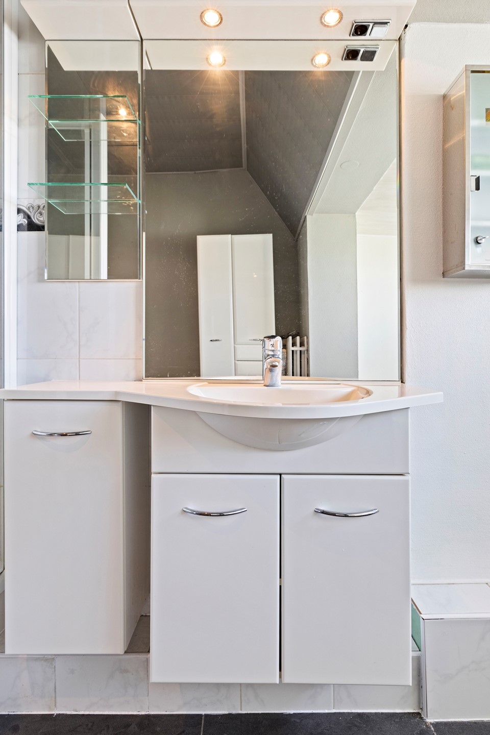Overloop. Bergkast. Drie slaapkamers afgewerkt met laminaatvloeren. Licht betegelde badkamer douche, badmeubel met wastafel en inbouwverlichting.