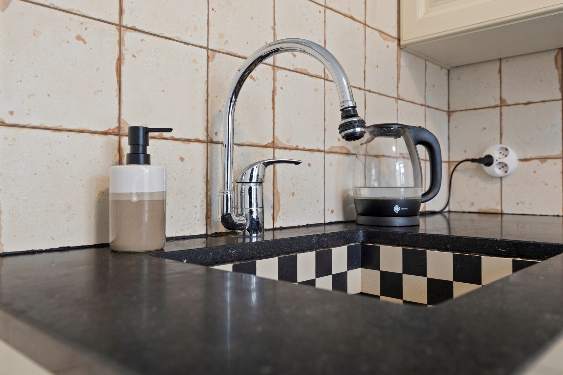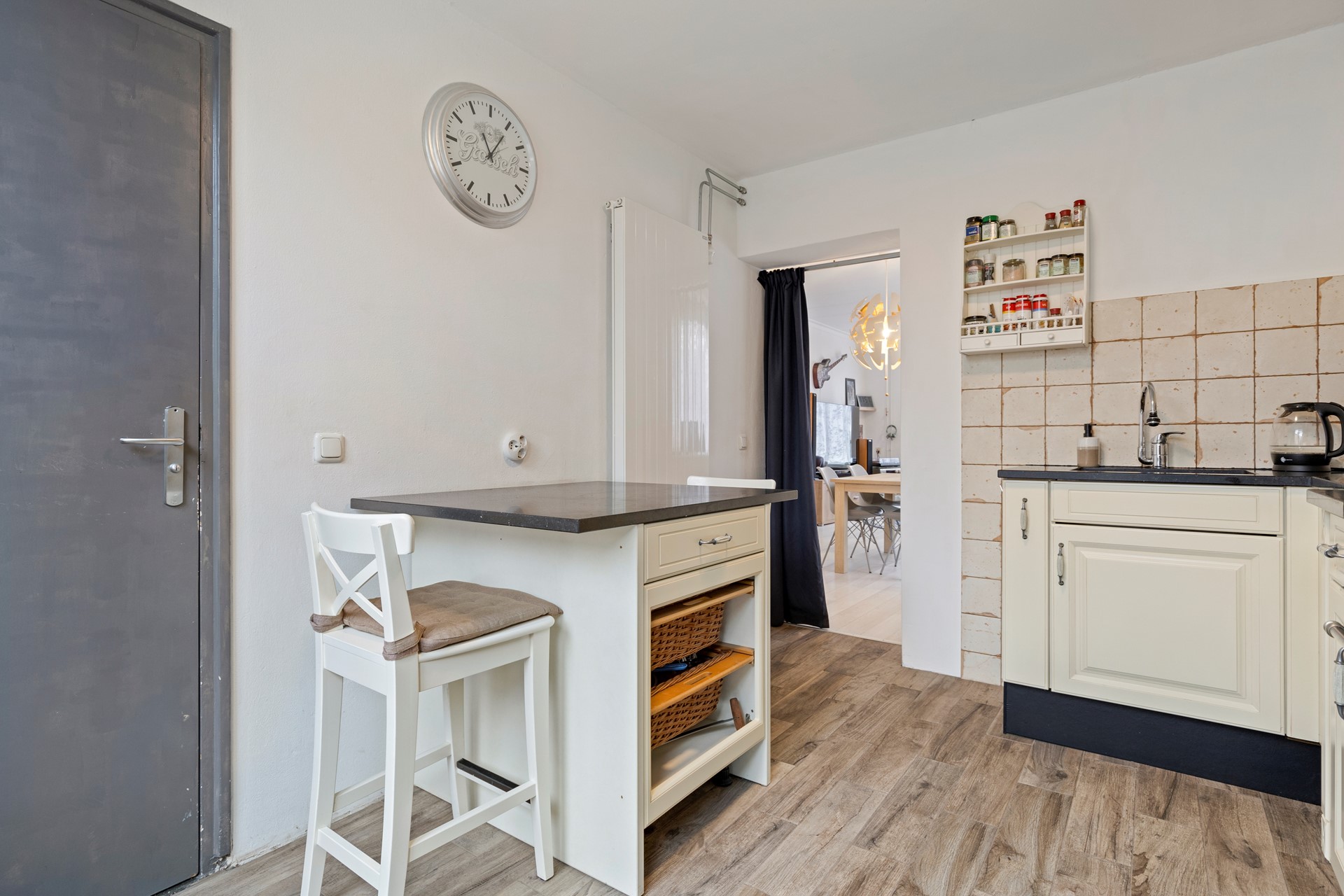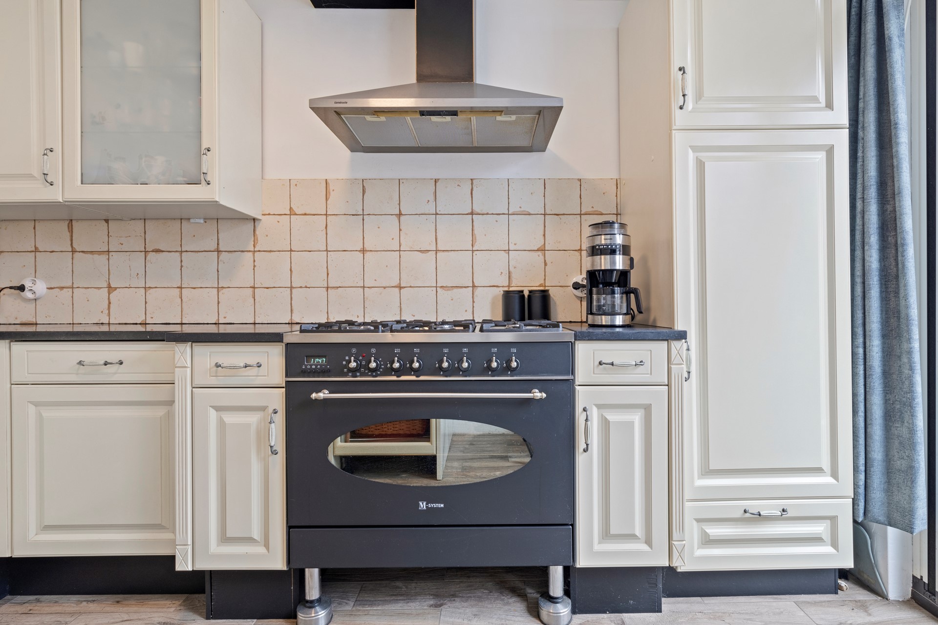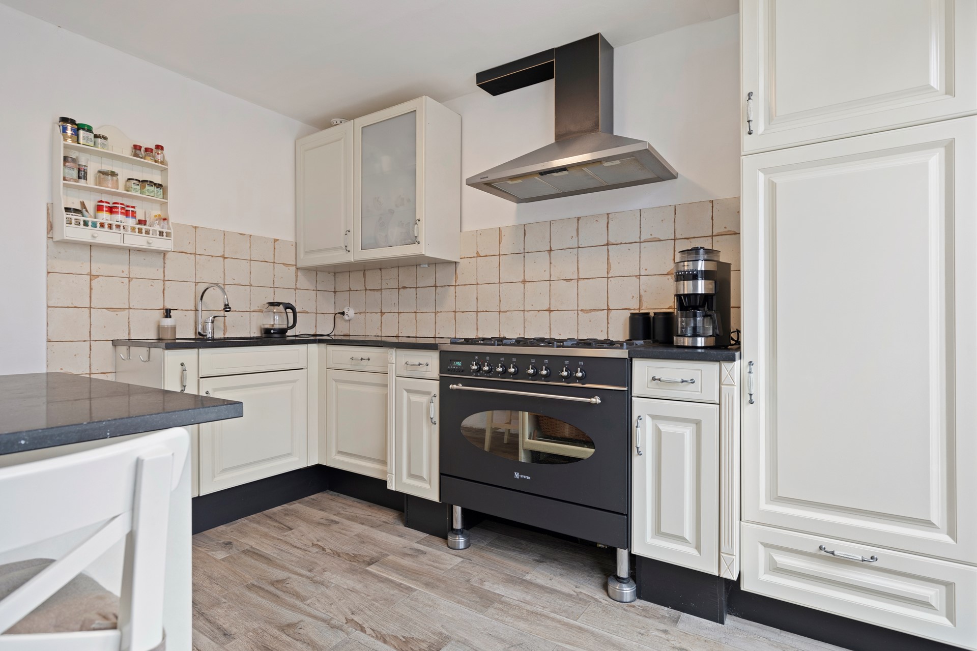 Ruime half open keuken 2.83 x 3.62 v.v. tegelvloer en keurige aanbouwkeuken v.v. luxe gasfornuis incl. oven en 6 pits gaskomfoor, los geplaatste inductie kookplaat, koelkastwasemkap en vaatwasser. Vanuit de keuken heeft men toegang tot de betegelde achtertuin.
