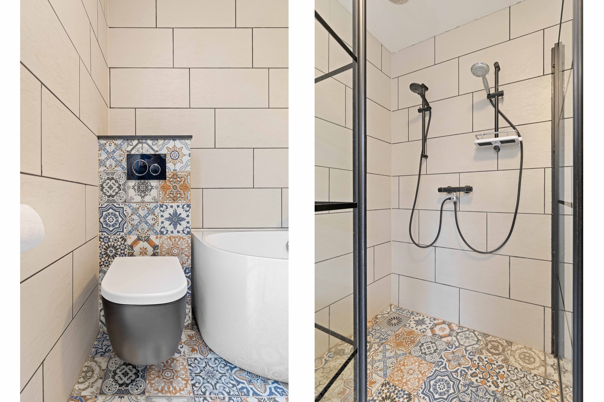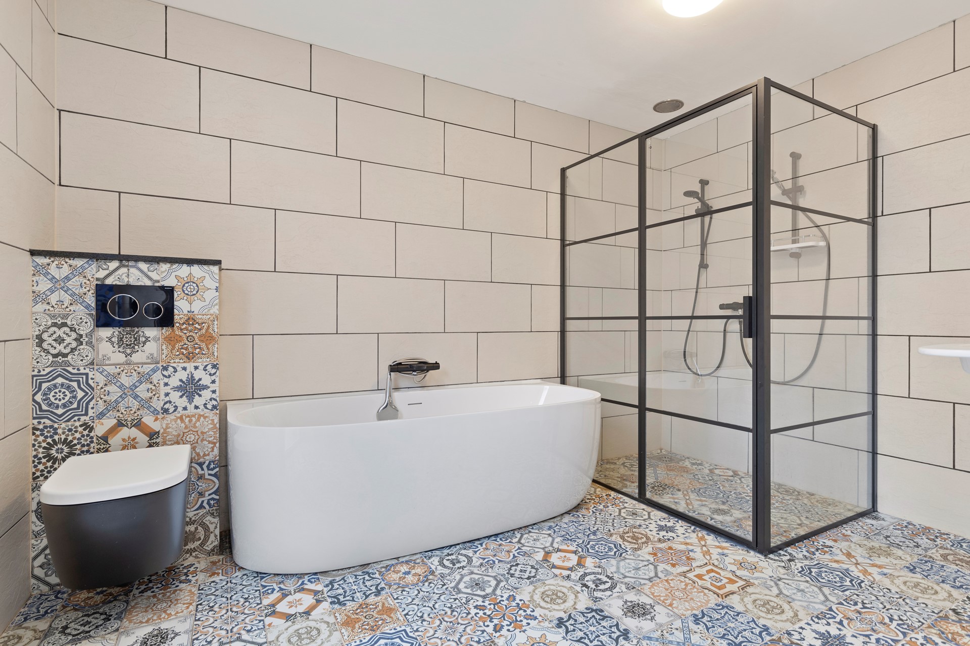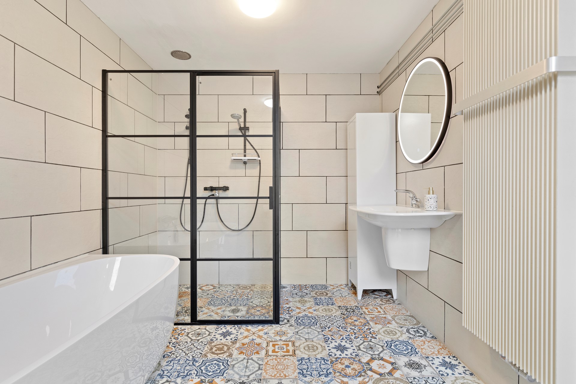 Geheel betegelde ruime badkamer 3.57 x 2.51 v.v. vaste wastafel, royale inloopdouche met thermostatische kraan, vrijhangend toilet en ligbad.