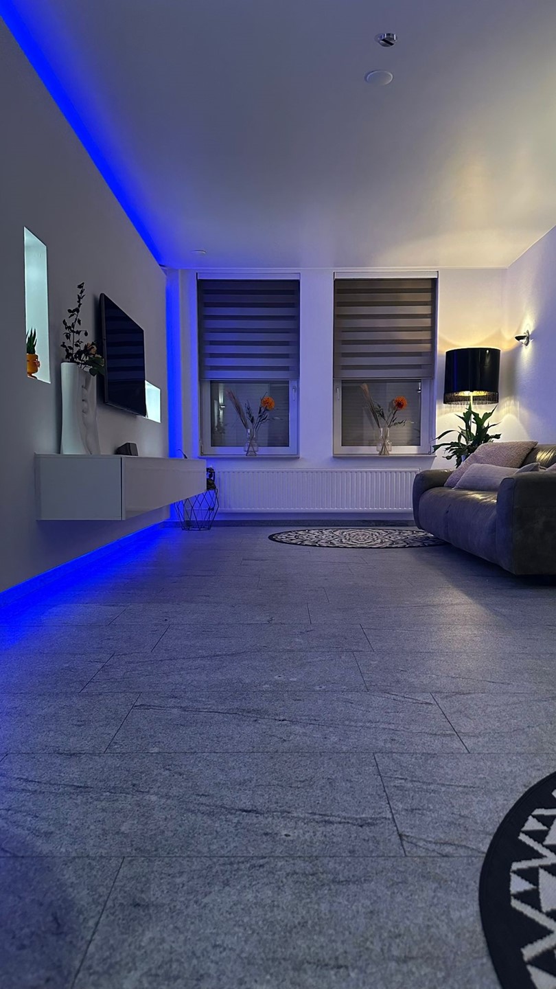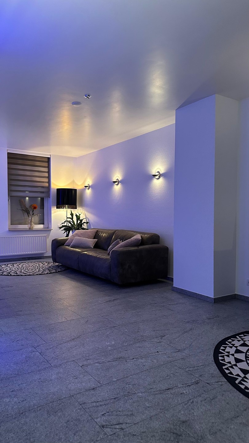 U betreedt de woning via de stijlvolle hal met indirecte verlichting en een glazen deur naar de keuken. De royale, lichte woonkamer (met airco!) heeft een mooi stucplafond en de mogelijkheid voor een houtkachel.