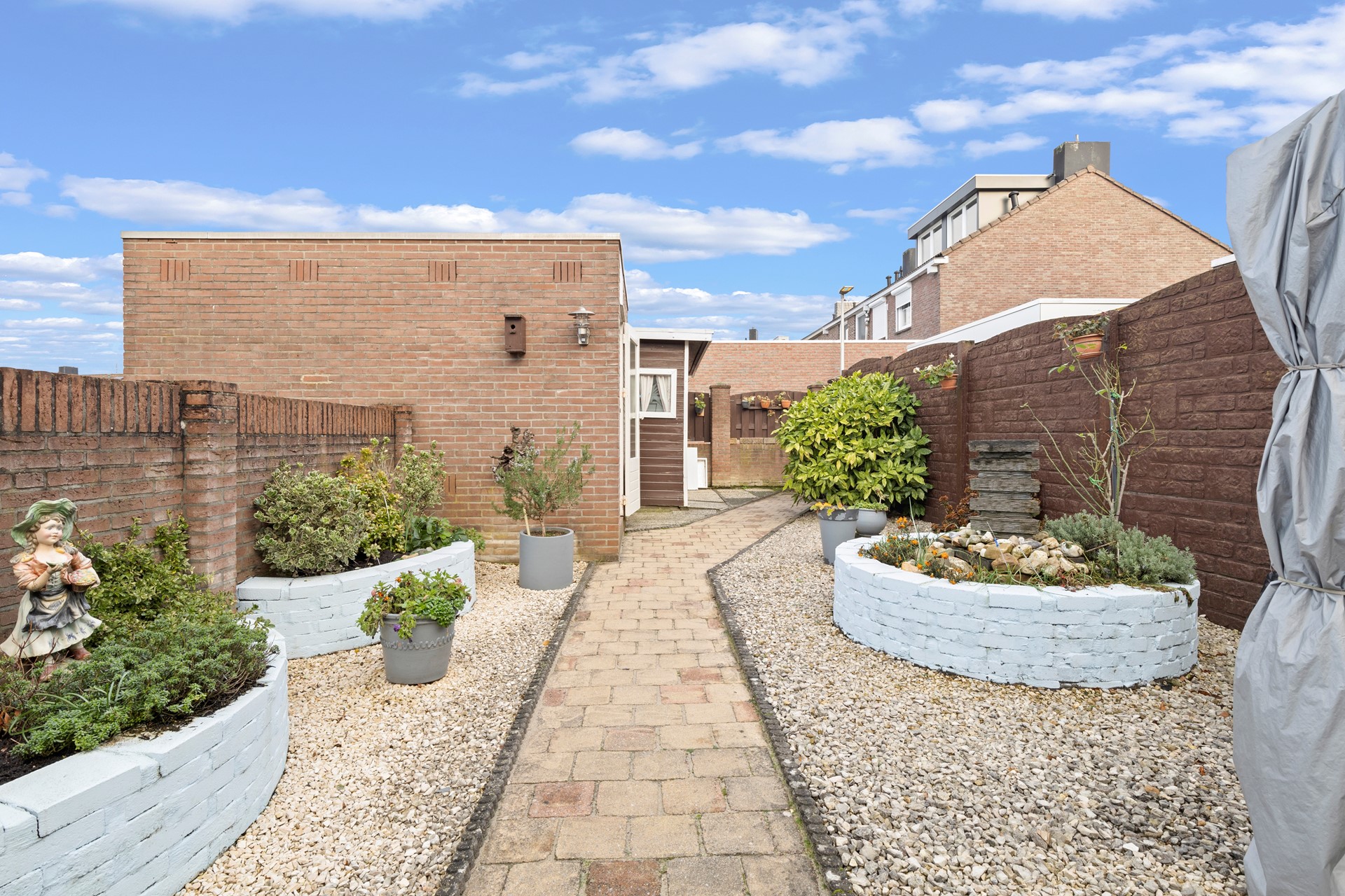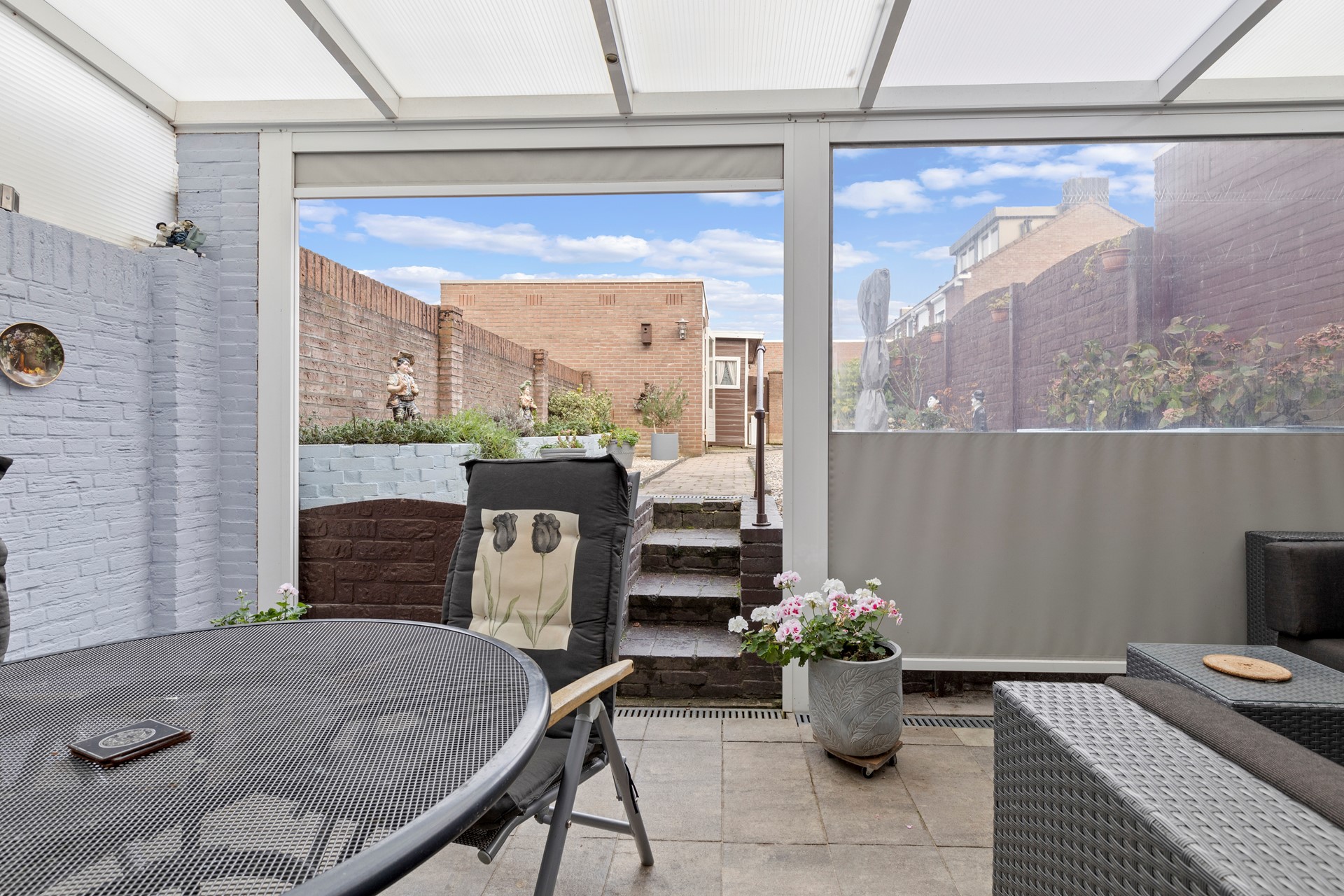 Royaal overdekt terras (geheel afsluitbaar voor weersinvloeden) en fijne tuin alwaar een ruime stenen berging met aangrenzende houten berging. De tuin heeft eveneens een achterom.