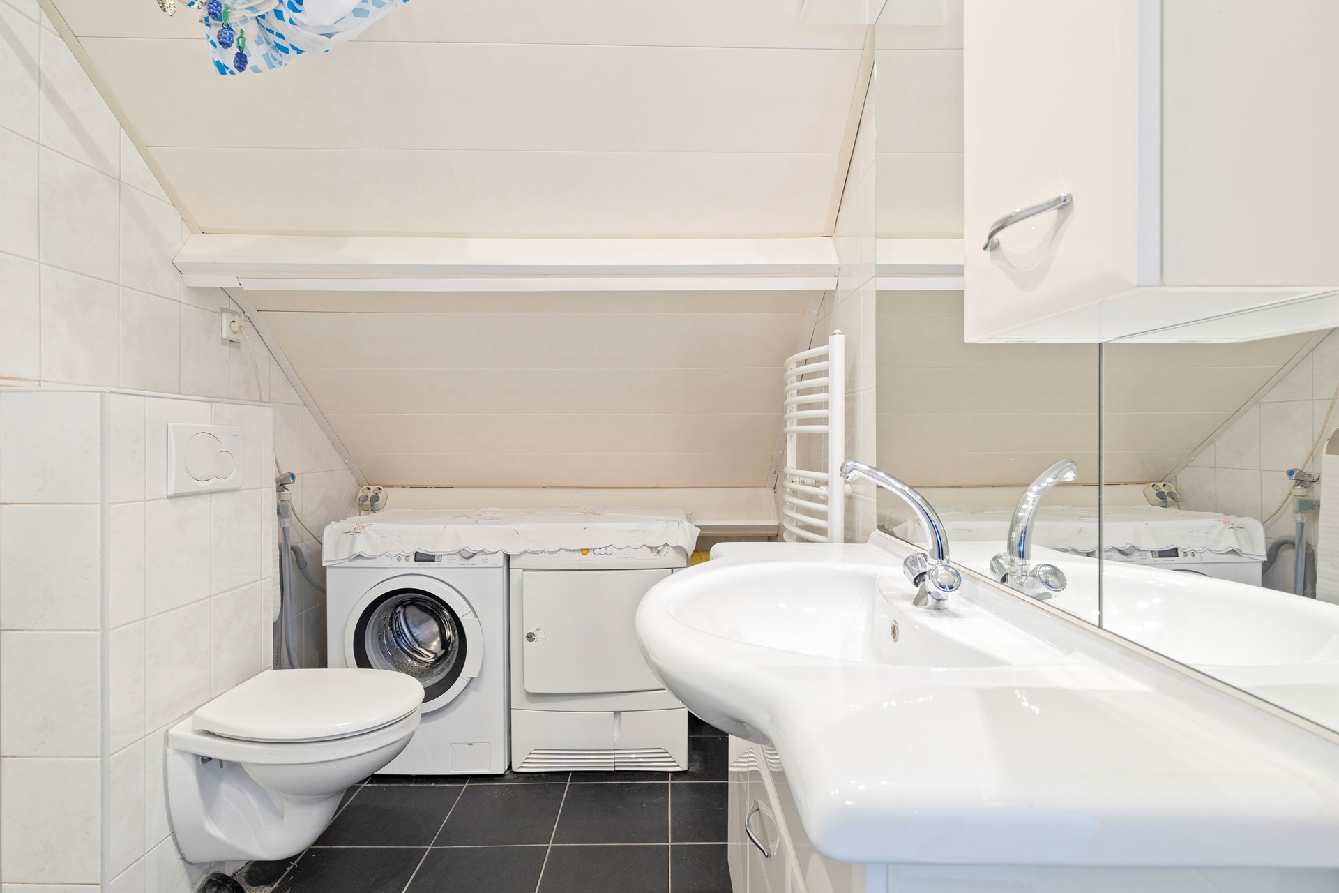 Betegelde badkamer voorzien van douche, badkamermeubel, 2e (vrij hangend) toilet met inbouwreservoir en aansluitpunten voor wasmachine en droger.