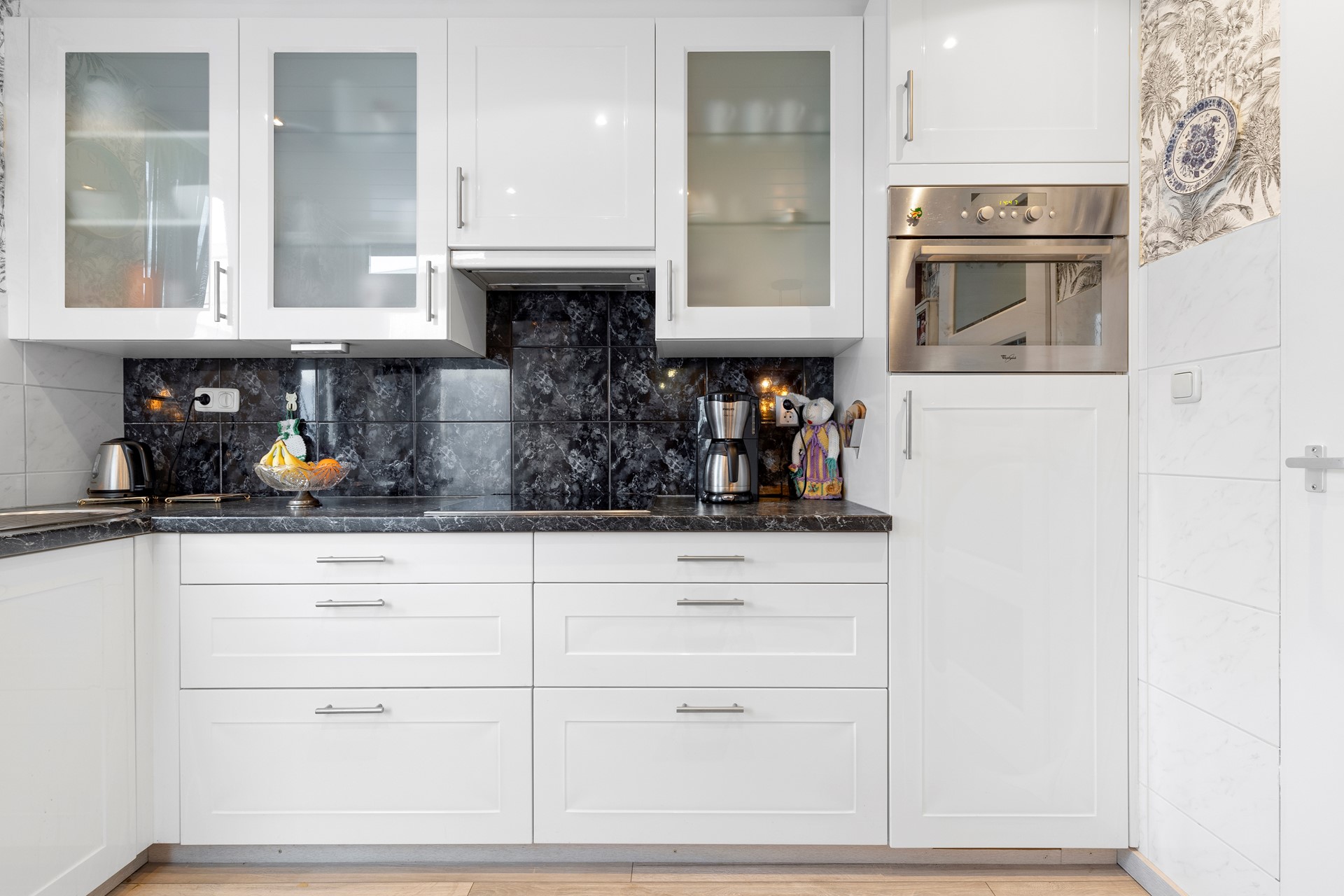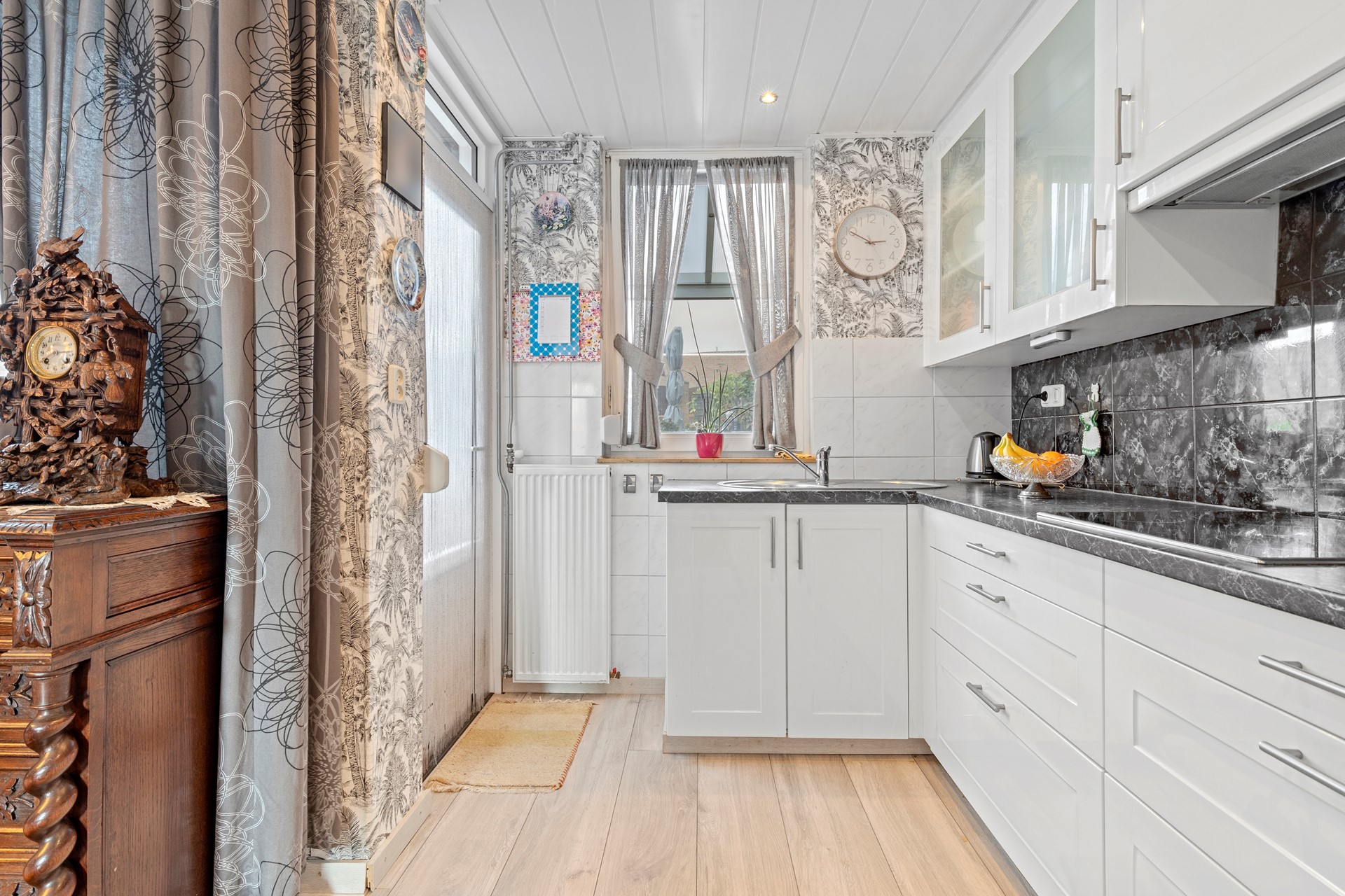 Half open keuken v.v. laminaatvloer en keurige witte aanbouwinstallatie incl. apparatuur, te weten combi-oven, koelkast en wasemkap. Ruime trapberging.