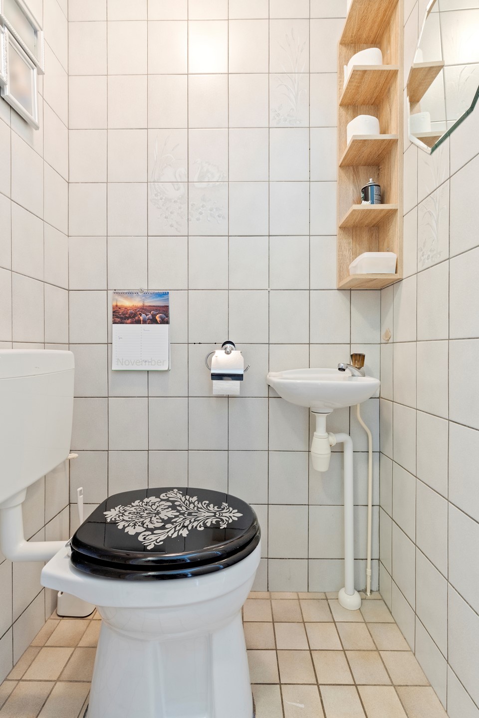 Geheel betegeld toiletruimte met fontein.